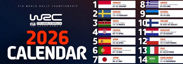 Após a tradicional partida em Monte Carlo, no final de janeiro, o WRC atravessará África, Ásia, Europa e América do Sul antes de chegar à Arábia Saudita a meio do mês de novembro, marcando o maior calendário de campeonatos do mundo desde 2008.